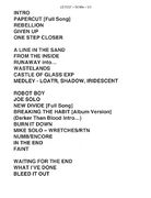 | 19. | Waiting For The End | Apaches Intro w/ "Until It Breaks" Verse 3; Wall Of Noise Outro |