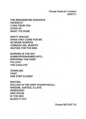- ↑ https://www.lpassociation.com/forum/threads/itunes-festival-london-2011-ep.34398/ LPAssociation: iTunes Festival: London 2011 EP