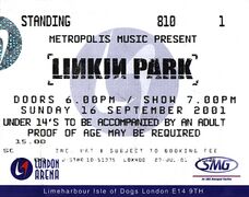 • The band debuted a new show intro for this show. This intro was popular for many years because of the Milano, Italy TV recording, but since this is the first performance of it, we have called it the Docklands Intro. The band went on to use it for the rest of 2001 after this show. Chester whispered "London" during the intro and said "Let me hear you, fucking London" on the transition into "With You".