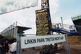 • Linkin Park, Limp Bizkit, 3 Doors Down and Steve-0 (who was still in jail) all canceled their appearances at Rock am Ring and Rock im Park 2003. Placebo was the official replacement announced on the 4th before the festival. Pinkpop switched its schedule around (after being asked by Marek Lieberberg Konzertagentur) to make Placebo be able to play Rock am Ring and Rock im Park so that their gear is there in time.