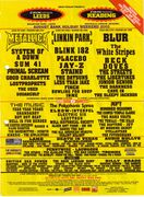 Blink-182, Placebo, The Darkness (replacement for Jay-Z), Staind, The Datsuns, Less Than Jake, Finch, Bowling For Soup, InMe