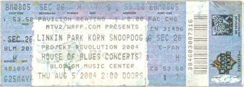 - Brad smashed a guitar at this show and donated it to the Hard Rock Cafe in New York City. Astat details the entire story behind this black PRS: "This guitar lived a very tortured life. It was originally rented from a music store in Los Angeles for the "Numb" music video shoot (they needed a black PRS on short notice, as Joe Hahn wanted an all-black color scheme for the instruments in the video). Brad happened to be wearing a belt with a large metal buckle the day of the video shoot...yep, you guessed it, buckle rash! The band wound up having to buy the instrument from the music store, since they damaged it. The guitar then found its way into Brad's touring rig for the Summer Sanitarium tour, where it was used as an Eb-tuned guitar. Since it was in the correct tuning for the song, this guitar wound up being used for "A Place for My Head" on one of the nights Brad didn't smash a cheap Ibanez...meaning it got smashed as well. The guitar was repaired, however, and returned for the 2004 Projekt Revolution tour, once again as an Eb-tuned guitar, and it once again became a "smasher" for "A Place for My Head," but with a twist: Brad and Sean (his guitar tech) got into a little competition involving this guitar, where Brad would smash it every night, and Sean would fix it and give it back to him at the next show, to see who would give up on the guitar first. Sean repaired this guitar over 20 times in total! At the August 3rd show in Camden, New Jersey, a piece of the headstock went missing, which would normally have been a "death blow" to the guitar, but instead, Sean grabbed a couple of Korn's drum sticks, glued them together to fill in the missing piece, glued the entire headstock back together, spraypainted it black, and glued one of Brad's guitar picks over the truss rod cover. At the following show in Cuyahoga Falls, Ohio on August 5th (my first Linkin Park show!), Brad tossed the guitar on the ground after "A Place for My Head" again, and this time Chester picked it up and REALLY made sure to smash it up. Brad told Sean after the show that he was giving up, and not to hand him that guitar again at the next show. Crew 1, band 0! The entire band (and Sean) ended up signing the guitar and donating it to the Hard Rock Cafe in New York City, but not before the black speed knobs were swapped out for gold ones (the band doesn't really like to use the gold knobs on their guitars, so they swap them out whenever they can)."