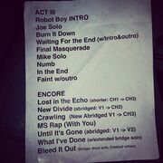 - Comments: First aired on DirecTV Audience channel 239 on December 5th at 9:00pm (changed from December 12th). "Guilty All The Same", "Points Of Authority", "One Step Closer", "Blackout", "Papercut", "Rebellion", "Robot Boy", "Joe Solo", "Burn It Down", "Final Masquerade", "Mike Solo", "Numb", "In The End", "Faint", "Crawling", "Until It's Gone", "Bleed It Out", and an interview with Mike & Chester only. Due to DirecTV receivers having encryption, only a low quality version circulated for over a year. In December 2015, the full recording was finally made available in HD, from a ProSieben broadcast.