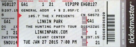• On January 20, 2015, the band announced, "Linkin Park regret to inform their fans they must cancel the remaining dates of The Hunting Party tour through February 14th, due to a leg injury of lead vocalist Chester Bennington. The injury requires immediate medical attention making it physically impossible for Bennington to perform. Chester says, I'm really disappointed this injury has made it impossible to continue with this tour. The first couple of shows were just magical. We will truly miss not being with our fans for the next few weeks. Hope to see you again soon." Fans can seek refunds at point of purchase."