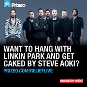 - Announced on September 29th, 2015. "To celebrate Music For Relief’s ten years of philanthropy a special performance and ceremony an event has been announced – Relief Live! is taking place on November 14, 2015 at LA River Studios in Los Angeles, CA. Relief Live! will see Linkin Park perform and also Steve Aoki is being honoured for his humanitarian efforts, he matched donations made by fans in wake of 2013’s Typhoon Haiyan, as well as his commitment to neuroscience research and animal rights." General tickets for the event are $250 and it is limited to 90 people (plus an additional 70 for VIPs).