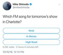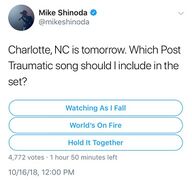- Mike put up two setlist polls on Twitter, asking which Post Traumatic song and which Fort Minor song he should add to the set. "Watching As I Fall", "World's On Fire", and "Hold It Together" were the Post Traumatic choices and "Kenji", "In Stereo", and "High Road" were the Fort Minor choices. "Watching As I Fall" and "Kenji" won.