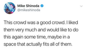 - After "Papercut", Mike decided to perform "It's Goin' Down" which was not on the show's setlist. On Twitter in response to us saying "WOAH" about it, he replied, "I was feeling the vibe".
