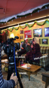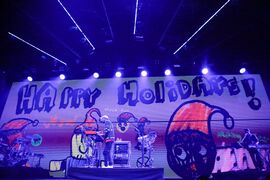 • Mike's stage backdrop appeared to be a large, digital Christmas-themed drawing that he and his kids drew and colored.
