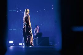 Emily appears to have snuck in the popular "'"Toothpaste, caught in the Lidl" meme line during 'Two Faced". However, Colin tweeted the day after the show, "I think what you’re hearing (toothpaste) is a convolution of hihat frequency artifacts mixed with her essing frequencies at 7-9k which is exacerbated by iPhone compression, resulting in the illusion of “toothpaste”. Is the dress blue and black or gold and white?"