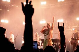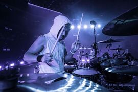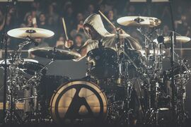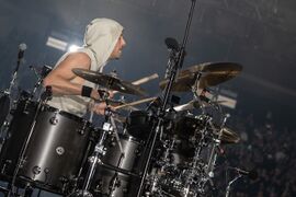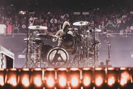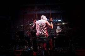 Mike threw his new drumstick he had made for "Overflow" into the crowd after the song from his keyboard stand.