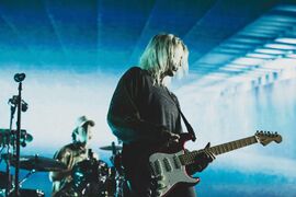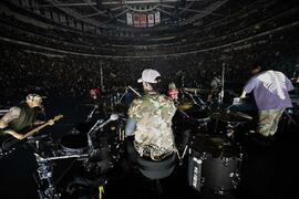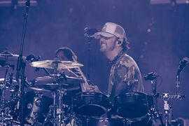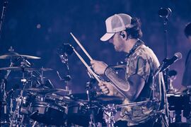 The crowd started chanting Emily"s name before 'Bleed It Out", which Joe joined in on drums. Emily remarked, "that was a... weird drum beat." Joe continued playing with Colin's drums during the song.