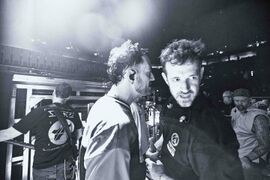 - On the intro of "Two Faced", Mike said, "Alright my friends. It's time. Now it's time for the bananas to lead us in this next activity." Emily chimed in, "Bananas gotta do banana splits, you know what I gotta say? That's what I gotta say! There's a lot of splits going on in this corner, you know what I mean? ...I'm sorry" After Mike continued to instruct the crowd to let the bananas through, the song began with Emily shouting "Let me see that split!" during the opening riff.