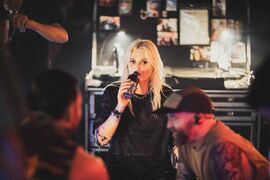 - Emily spoke to the crowd (and screamed at them) on the intro of "Two Faced": "Where's the pits in this place? Do we got any over here? Over here? Over there? Over there! Over there... I'm glad to see we're dressed for the occasion. It's like Looney Tunes and "Two Faced"... Sorry I'm cursing a lot, there's kids here. AHHHH! There's no school! It's the weekend!" During the bridge, she challenged, "Are you ready for a standoff?"