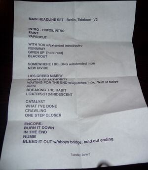 At this time, Linkin Park performed two distinct rotating setlists in Europe. Their "festival" setlist opened with "A Place For My Head" while the "headlining" setlist opened with "Tinfoil" and "Faint". As such, Berlin received the headlining setlist.