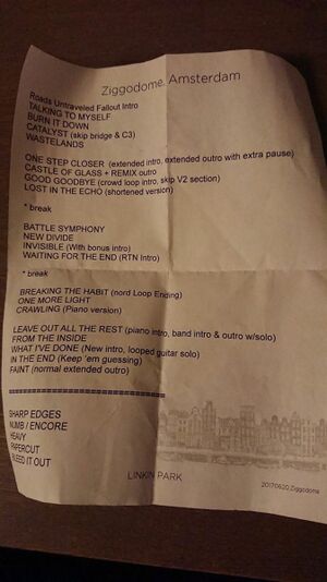Show setlist for the June 20, 2017 show in Amsterdam, Netherlands, which has the most "One More Light Live" songs of any show on the European Tour