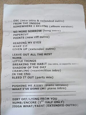 Months after the show, an earlier draft of the setlist was sent to LPLive from a fan who attended the show and was in the front row. This setlist featured "Reading My Eyes" and "Dirt Off Your Shoulders/Lying From You", which hadn't been played since 2005 at Live 8.